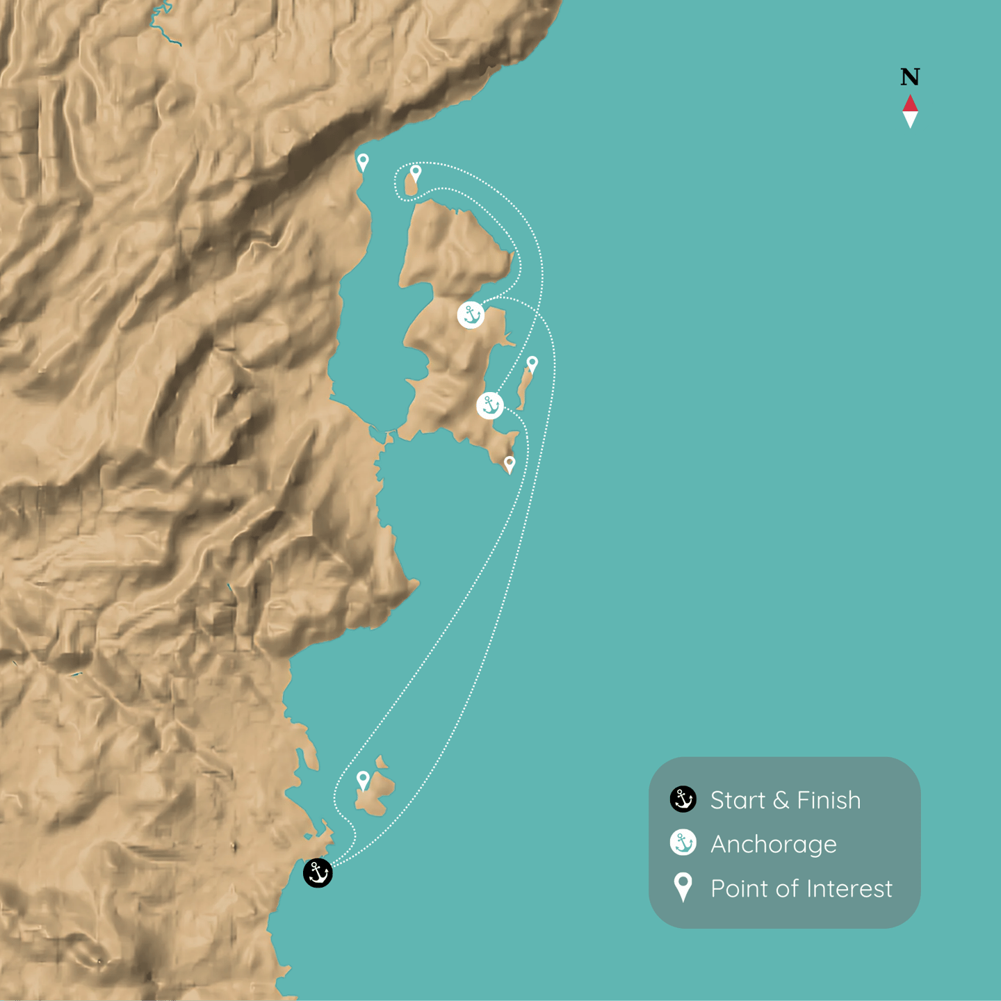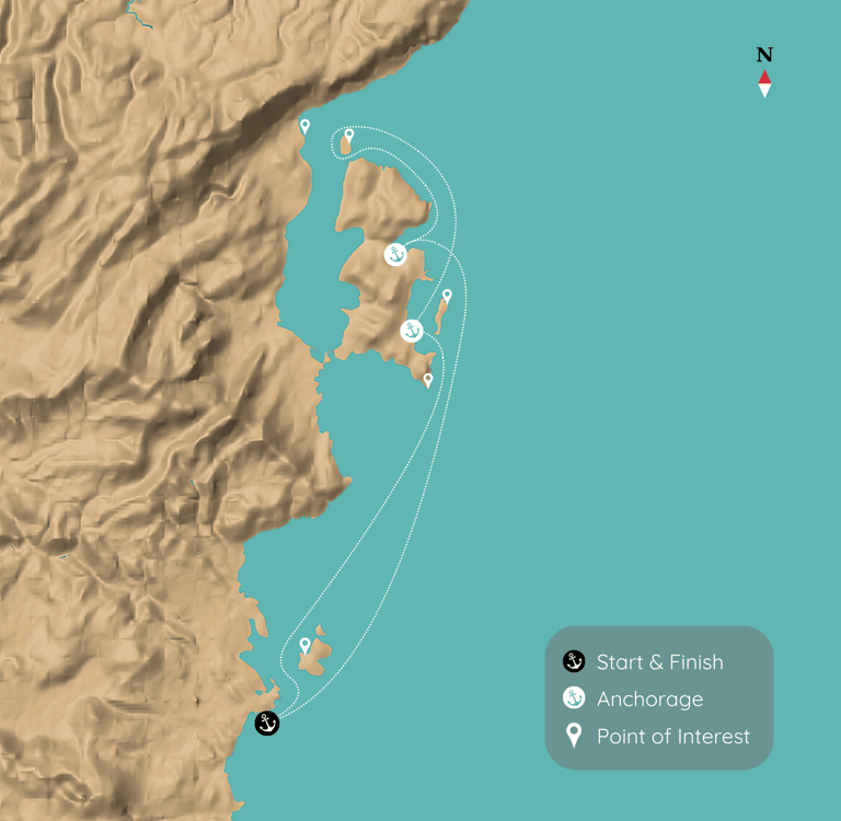 Depart from Agios Nikolaos and enjoy breathtaking stops. The serene Kolokytha Beach and a scenic passage between Spinalonga and Plaka. Finally an extended anchorage at Krios Bay where you can unwind. Along the way, marvel at the rugged beauty of Barbarossa’s Cave before returning to port, filled with memories of a perfect day at sea.