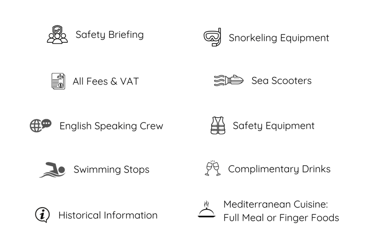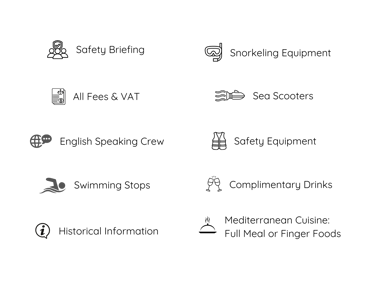 There, we anchor for one and a half hours offering you the time to relax and enjoy the sea even more while tasting delicious finger foods.